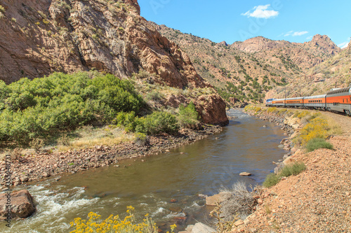 The Royal Gorge Railroad travels along side the Arkansas river in the canyon in Colorado, USA.
