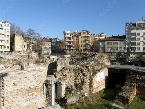The ruins of an ancient stone structure below ground level against the background of modern multi-storey buildings on a Sunny day with a blue sky