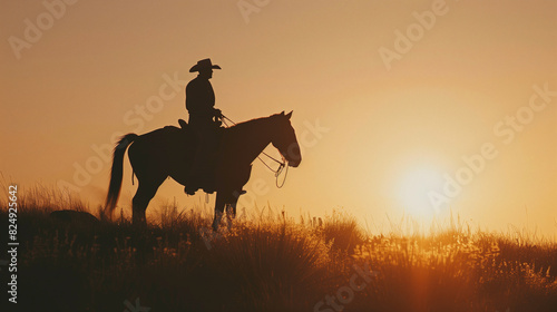The silhouette of a cowboy riding a horse on the prairies against the background of the sunset. A cowboy on a horse in a field.