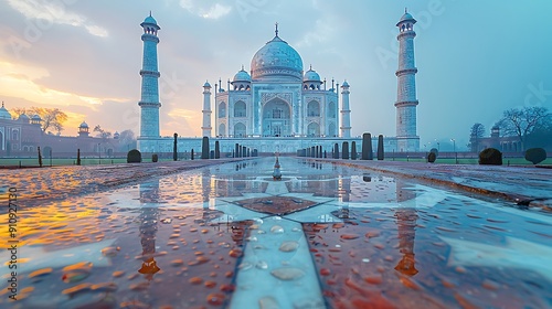 The Taj Mahal at dawn, with a soft pink and purple sky, the monument glowing in the early light, and the gardens covered in morning dew. DSLR, wide-angle lens, vivid colors, and soft focus film.