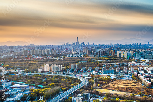 The urban context of Beijing outlined by the expressway in Beijing, China in the evening