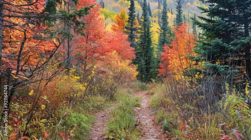 The vibrant colors of fall foliage create a stunning backdrop for a peaceful autumn hike, with the rich reds, oranges,