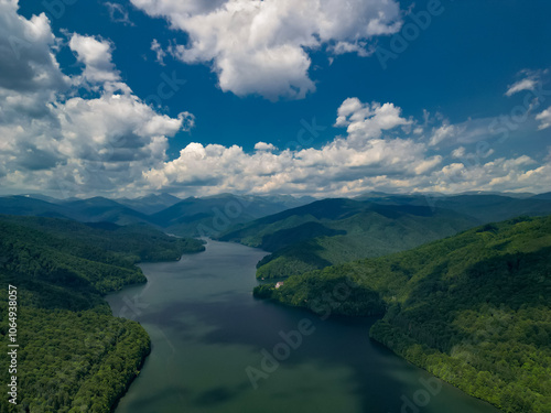 The Vidraru hydroelectric dam seen from the drone. Huge mountain lake at the edge off a big and wild forest in the summer season