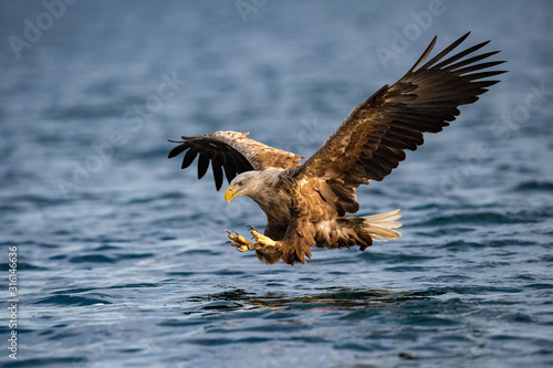 The White-tailed Eagle, Haliaeetus albicilla just has caught a fish from water, colorful environment of wildness. Also known as the Ern, Erne, Gray Eagle. Norway. Nice summer background.