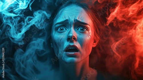 The woman’s face contorts with fear, her wide eyes and open mouth framed by a swirling mist of eerie blue and red, creating a hauntingly dramatic scene.