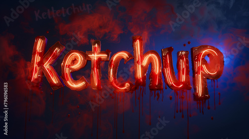 The word "Ketchup" creatively written in rich, red ketchup on a dark screen, creating a striking contrast. The glossy texture of the ketchup adds depth to the lettering, making it stand out