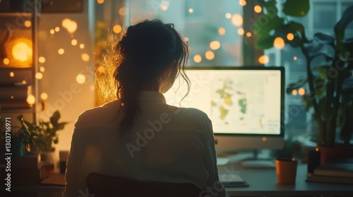 The worker leans forward engaging attentively with colleagues onscreen. Their cozy home studio is filled with minimalistic furniture and a large window that floods the space with natural