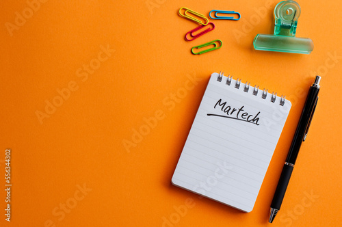 There is a notebook with the word MARTECH. It's placed on a color background.
