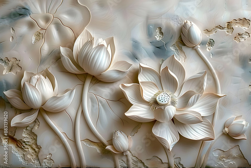 There is a stucco sculpture of lotus flowers on the wall of a bedroom.