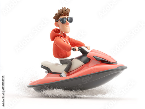 These 3D cartoon illustrations feature a small child and a large man riding sleek personal watercraft. They wear goggles and vests while splashing through crisp white water.