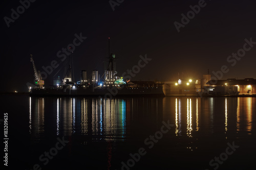 Thessaloniki, Greece Greek warship Averof moored at port at night.