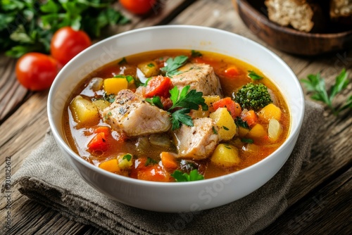 Thick hearty Soup with carp steak, vegetables and paprika, in white bowl, isolated on white background
