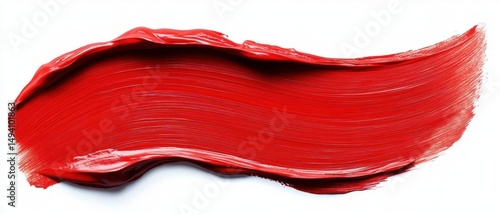 thick vibrant red paint brushstroke with textured surface on white background showing dynamic motion and glossy finish