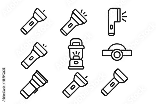 Thin Line Camping Flashlight Icon Set for Web Design, Mobile Apps, Advertising, Emergency, Hiking, Outdoor Activities, Lantern, Headlamp, Torch, Graphic Vector Illustration Transparent Background