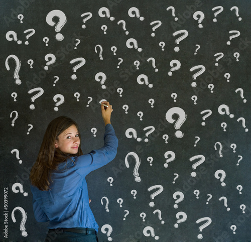 Thinking business woman with chalk question marks