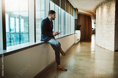 Thinking, tablet and business with man in office for planning, rpa management and ai software development. Networking, technology and chatbot project with person in digital agency for startup