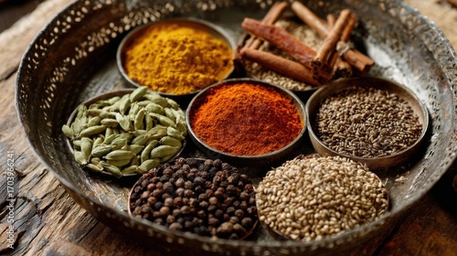 This arrangement showcases various spices including turmeric, cinnamon, and cardamom displayed in elegant metallic bowls on a rustic wooden surface, emphasizing culinary flavors.