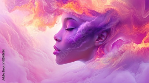 This artwork features a woman's profile harmoniously blended with swirling purple and orange clouds, reflecting a dreamlike quality filled with emotion and creativity