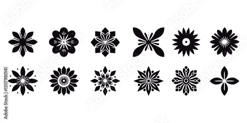 This black flower vector pack includes geometric motifs and abstract floral design silhouettes. Perfect for design projects, branding, and adornment. incorporates simple botanical motifs for imaginati