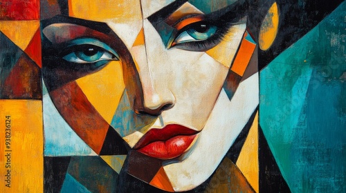 This captivating cubist artwork presents a woman's face composed of bold geometric shapes and segmented lines, creating an engaging visual experience