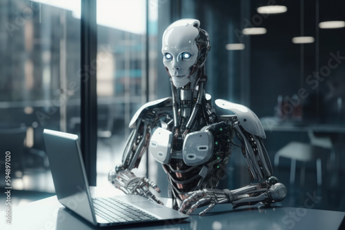 This futuristic cyborg, with humanoid features, is the perfect addition for tech-based designs. Whether it's working on a computer or other tasks, this robot is reliable and precise.