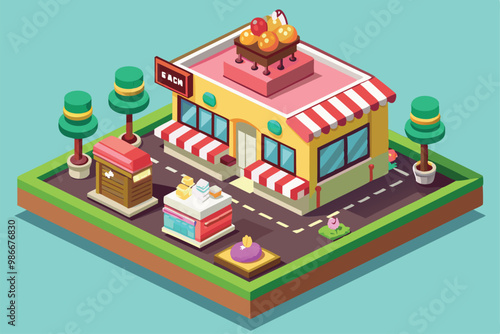 This illustration showcases a lively cake shop featuring colorful desserts, outdoor seating, and a welcoming atmosphere, Customizable cake shop illustration in isometric style.