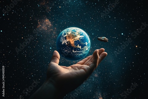 This image displays a single hand offering the Earth with a nearby spaceship in outer space, symbolizing exploration, protection, and the vast potential of human discovery.