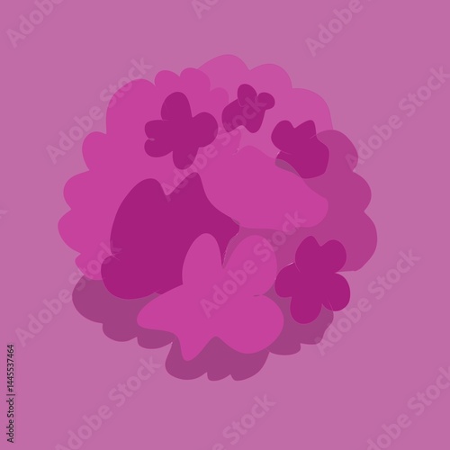 This image features an abstract composition of overlapping, flower-like shapes in various shades of pink and purple, set against a solid pink background.