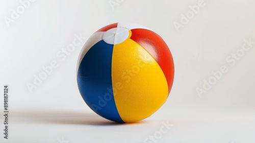 This image shows a colorful beach ball with multiple segments in white, blue, yellow, and red colors, against a white background, perfect for summer themes.