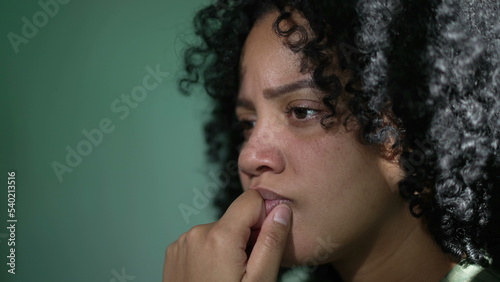 Thoughtful African American woman face thinking. A pensive black girl leaning on wall hand in chin pondering solution 2
