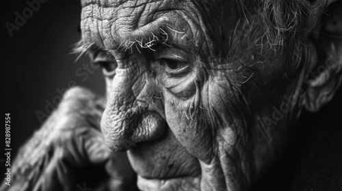 Thoughtful black and white portrait of an elderly man with a deeply wrinkled expression