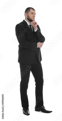 Thoughtful businessman in suit on white background