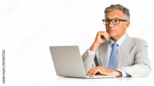 Thoughtful businessman working on laptop, white background, planning, business strategy