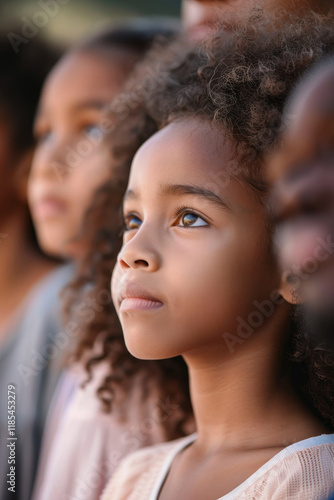 Thoughtful girl gazes into the distance, captivated by emotions and moments, surrounded by friends in a serene outdoor setting, showcasing diversity and innocence
