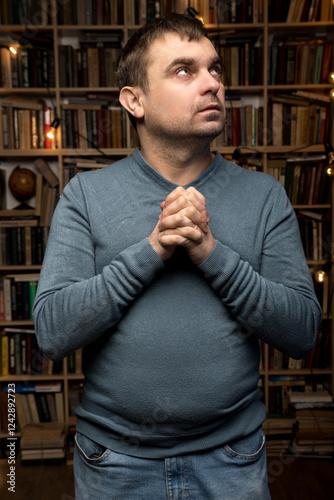 Thoughtful man in a blue sweater standing in a library with hands clasped, looking up. Concept of prayer, hope, faith, thinking, decision-making, and self-reflection.