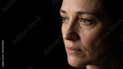 Thoughtful Woman Portrait - Dramatic Black Background with Soft Lighting