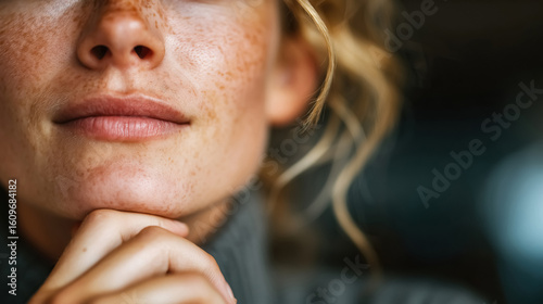 Thoughtful woman with natural freckles contemplating life's beauty with gentle smile and serene expression