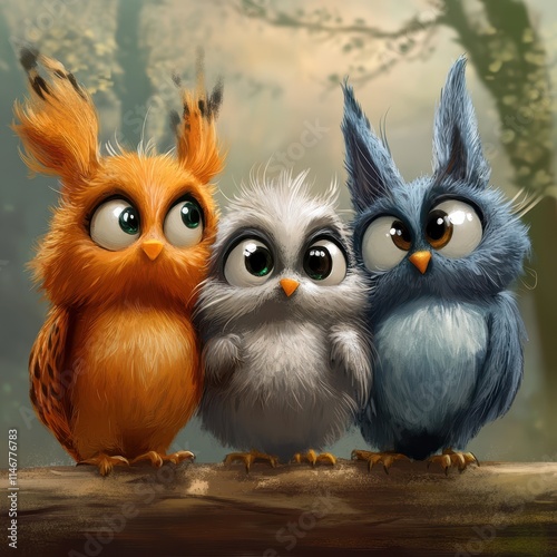 Three Adorable Cartoon Owls Perched On A Branch