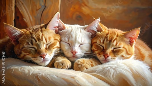 Three adorable domestic cats are peacefully sleeping together, nestled closely, their eyes closed, and soft fur visible in a warm, sunny indoor setting, exhibiting feelings of contentment and...