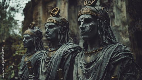 Three ancient statues, facing forward, in a stone structure.