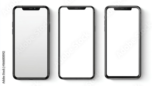 Three black smartphones with blank screens, viewed from above