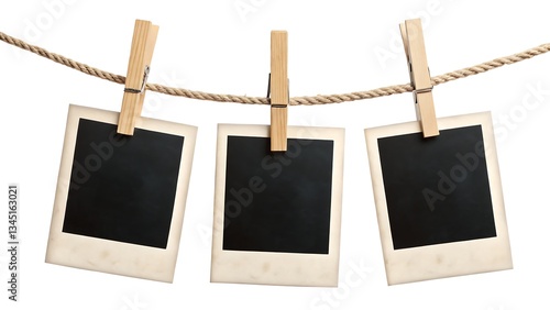 Three Blank Vintage Photographs Hanging On A Clothesline, Evoking Nostalgia And The Untold Stories Waiting To Be Captured On Film, With Simple Rustic Wooden Clothespins