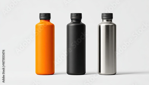 Three bottles, orange, black, and silver, stand on a plain white surface