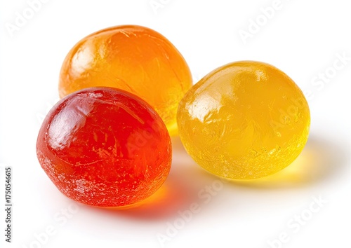 Three brightly colored, round hard candies, orange, yellow, and red, are positioned on a plain white background. The candies appear glossy and slightly textured