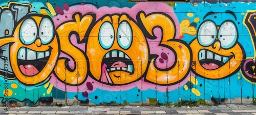 Three Cartoon Faces Graffiti Art on a Textured Wall, Urban Street Art and Culture, Vibrant Colors