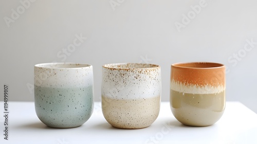 Three ceramic cups on a table, varying earthy tones, minimalist design, perfect for showcasing artisanal pottery style.