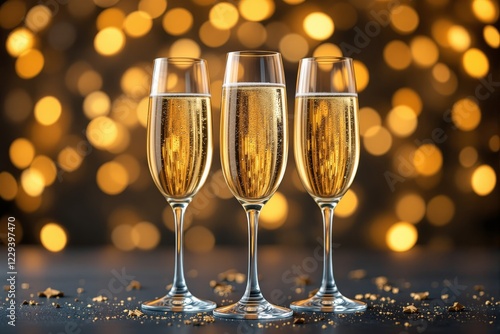 Three champagne glasses filled with sparkling liquid, golden bokeh lights in the background, festive and celebratory concept, elegant and bright. Ai generative