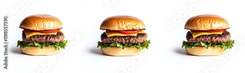 Three cheeseburgers with lettuce, tomato, and cheese on sesame buns, isolated on white.