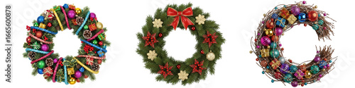 Three christmas wreaths decorated with ornaments and bows, isolated on transparent background