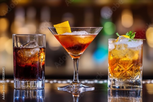 Three cocktails on a bar counter, with a martini, a whiskey, and a soda.